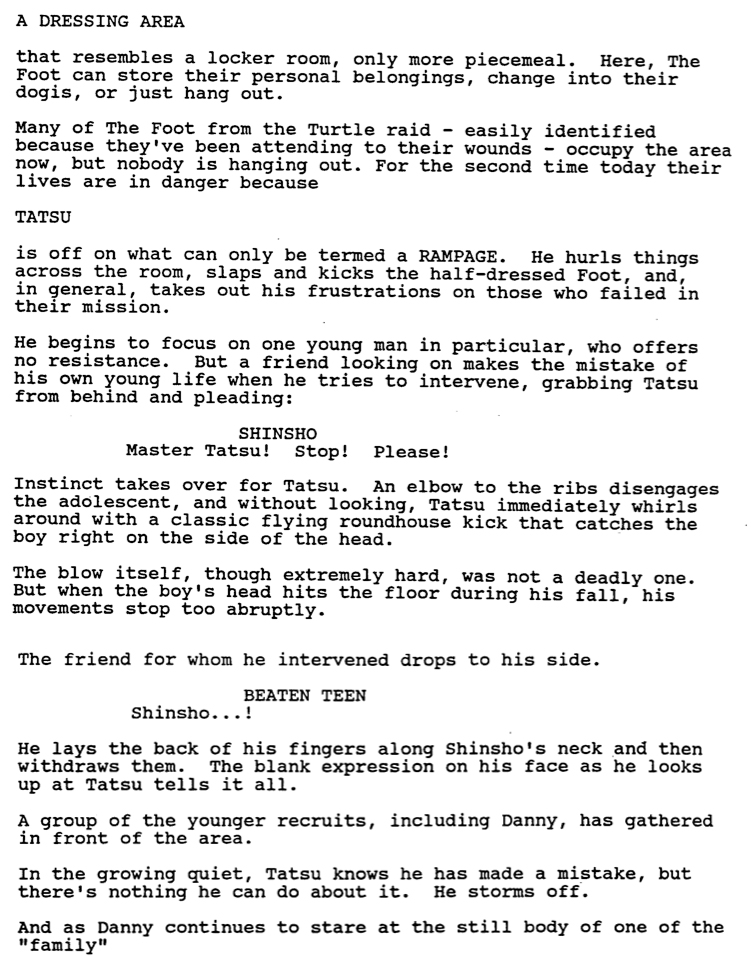 In the original script, Tatsu beats one of the Foot ninjas, named Shinsho, to death. This plot point was altered in post-production; the moviemakers added breathing sounds and dialogue to show that Shinsho was still alive.